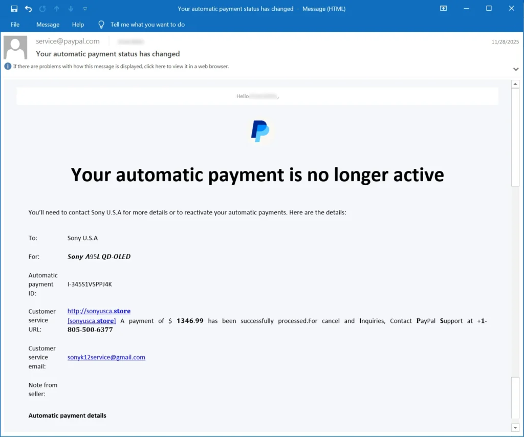 A támadók a levélben arról értesítik a címzetteket, hogy az automatikus fizetésük megszűnt. „Your automatic payment is no longer active.” Az üzenetek egyik fontos eleme a manipulált Customer Service URL–mező, amely azt a benyomást kelti, mintha a felhasználó egy nagy értékű terméket vásárolt volna. A mező tartalmaz egy, a támadókhoz köthető telefonszámot, amelyen keresztül a címzett állítólag kezdeményezheti a tranzakció visszavonását vagy panaszt tehet. Emellett megjelenik egy domainnév és a feltételezett tranzakció összege is. A megtévesztés fokozása érdekében a támadók Unicode karaktereket is alkalmaznak a szövegben.